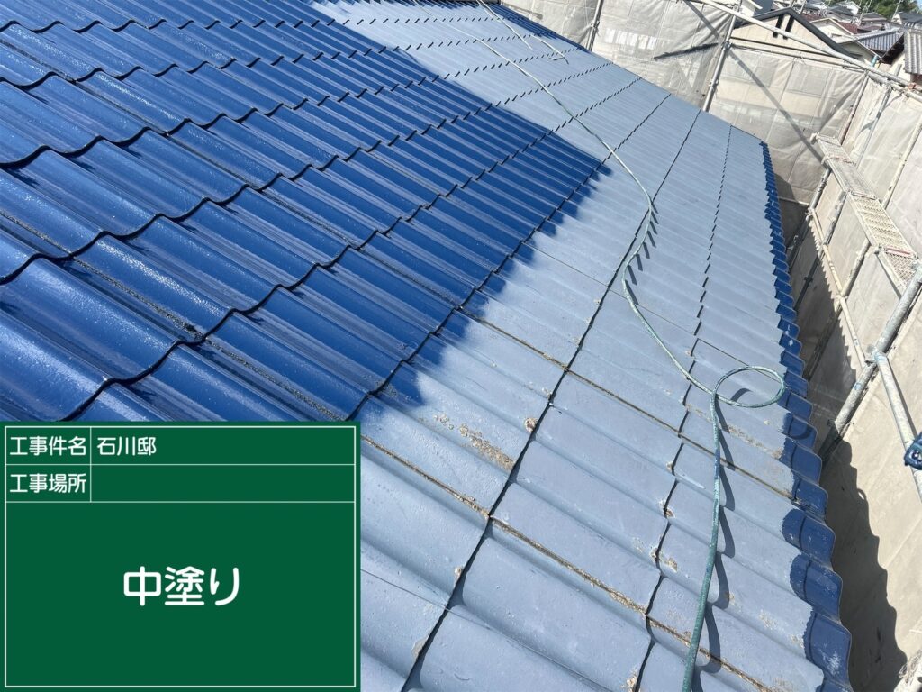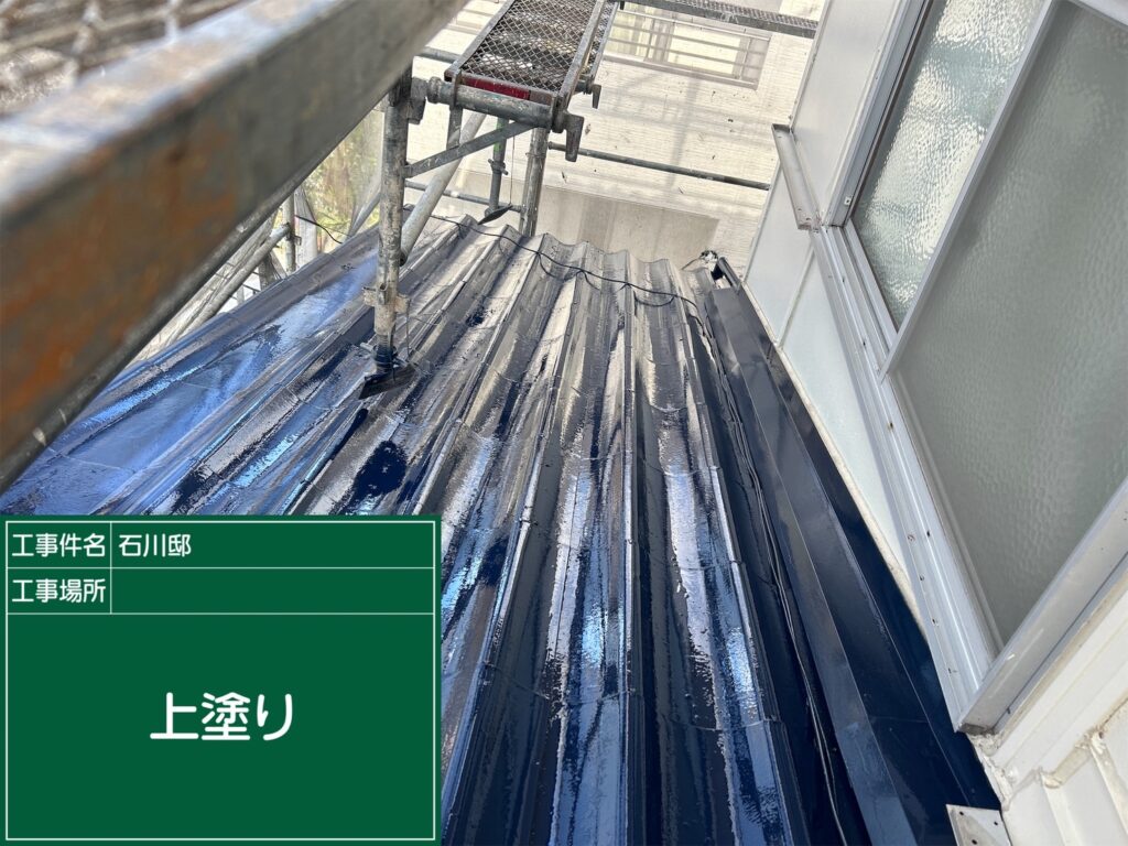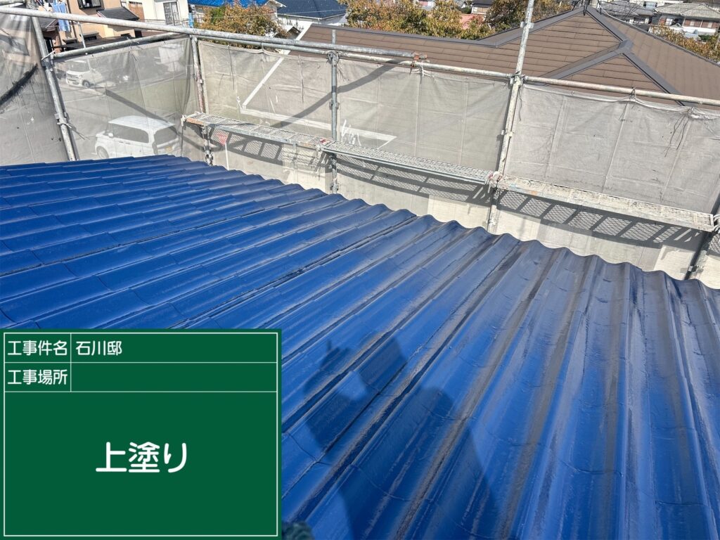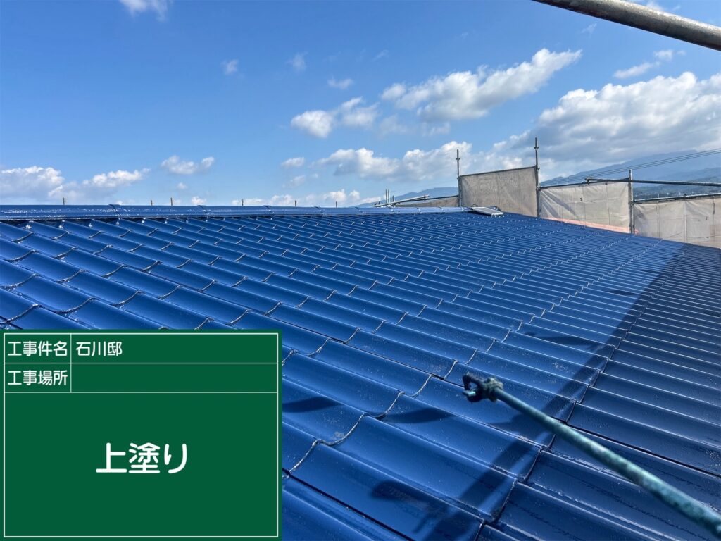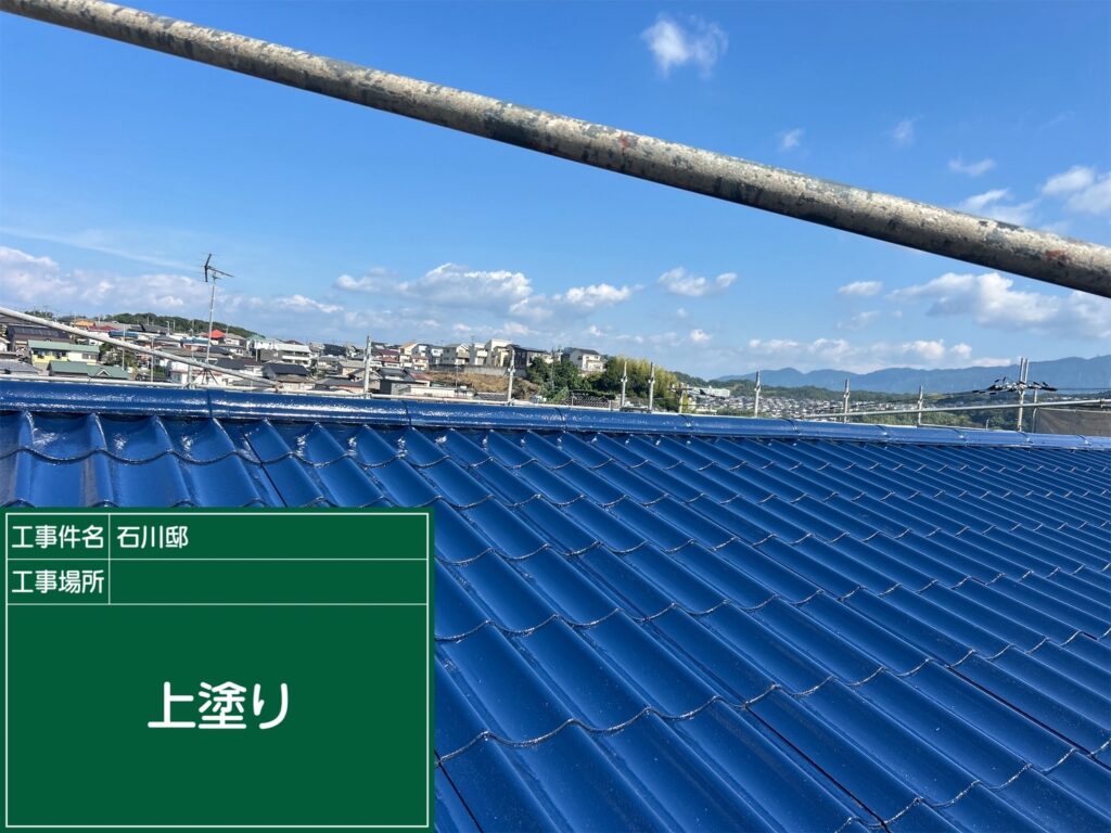 上塗り後の美しい青色の屋根が広がっている様子をご覧いただけます。